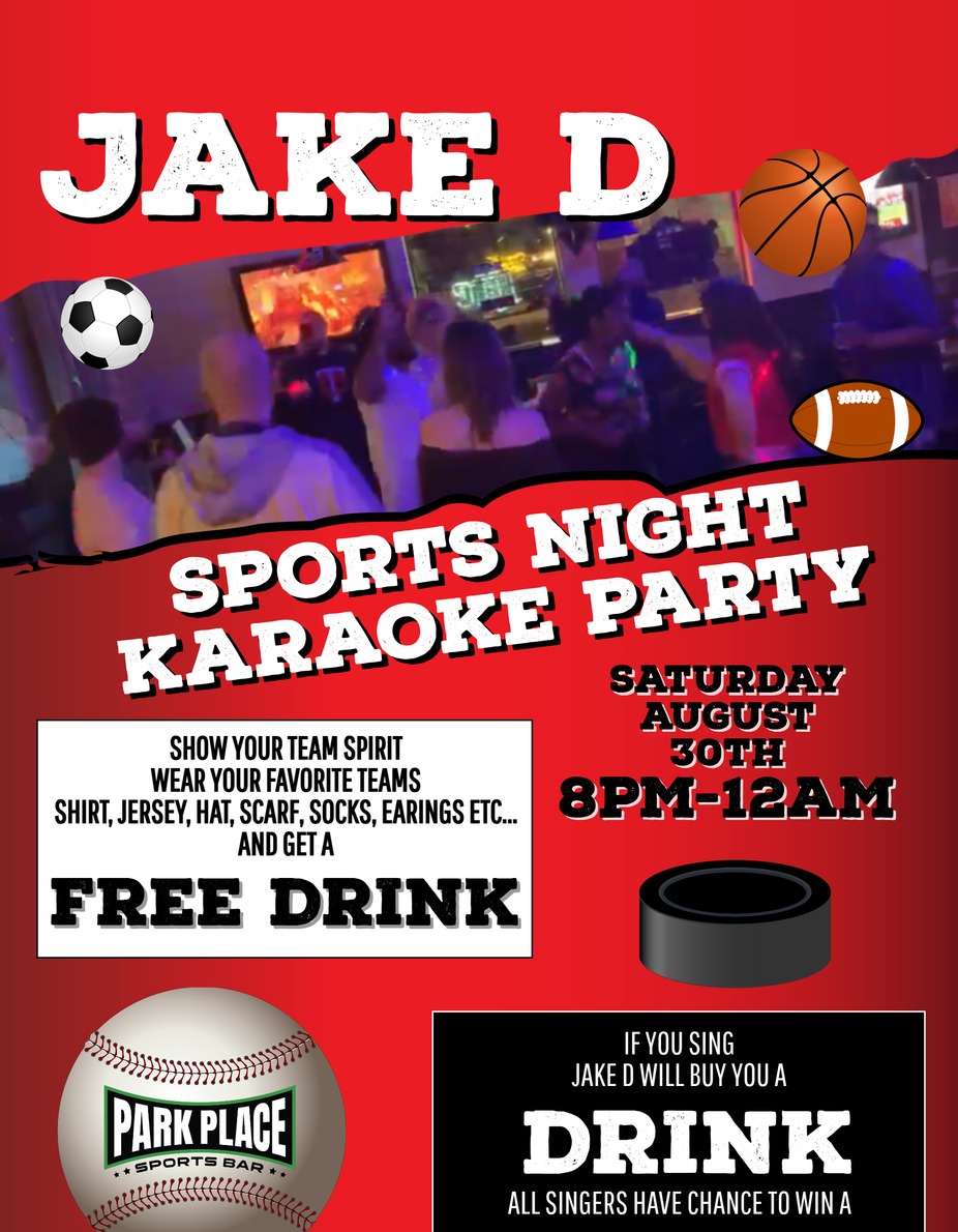 JAKE D’s SPORTS THEME KARAOKE PARTY. Rep your team. Rock the mic. Score the prizes. Wear your favorite team gear — hat, shirt, jersey, socks, earrings, whatever shows your colors — and get a FREE drink. Sing a song from our Sports Theme Song list and you’re in the drawing for FREE drinks & a Park Place Gift Card